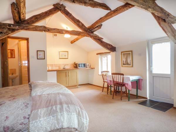 The studio accommodation is charming and homely with original A-frame beams and a wood burner in an inglenook fireplace.